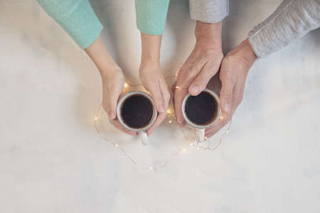 Couple in love holding hands with coffee on white marble table, with christmas lights. Photograph taken from above, top view with copy space