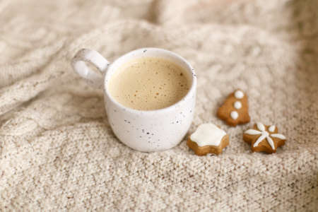 Warm coffee in stylish cup on background of cozy knitted sweater with christmas gingerbread cookies. Atmospheric winter hygge. Happy Holidays