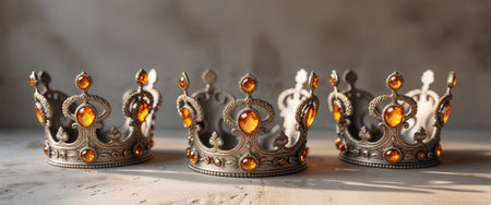 AI Generated. Three Ornate Crowns with Glowing Amber Jewels