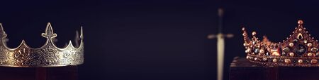low key image of beautiful queen/king crown over antique box next to sword. fantasy medieval period. Selective focus