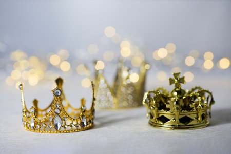 Epiphany Day or Dia de Reyes Magos concept. Three gold crowns on light sparkling background
