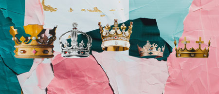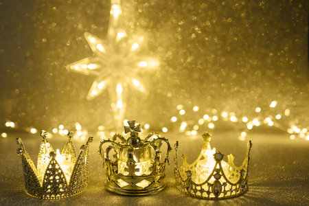 Bask in the regal glow of three gold shiny crowns adorning a festive background, creating a majestic ambiance in honor of the Three Kings Day or Epiphany night celebration. This enchanting image captures the essence of the holiday.
