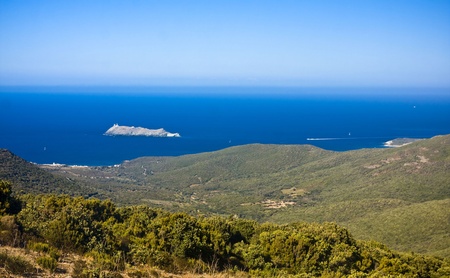High angle view over entire island of Elba at summit station of Monte Capanne cable car.