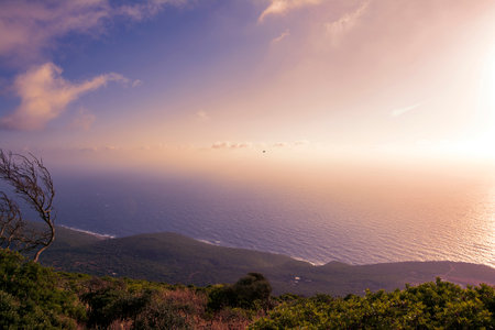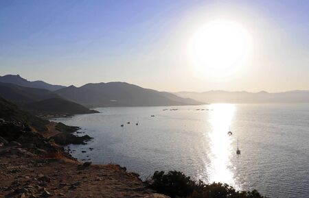 Sunset over the coast of Corsica near Ile Rousse with a seagull in the distance