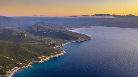 Aerial view of the coast of Corsica, winding roads and coves with crystalline sea. Cap Corse Peninsula, Corsica. Coastline. Anse d'Aliso. Gulf of Aliso. france