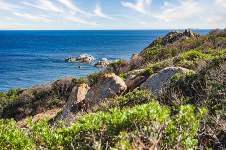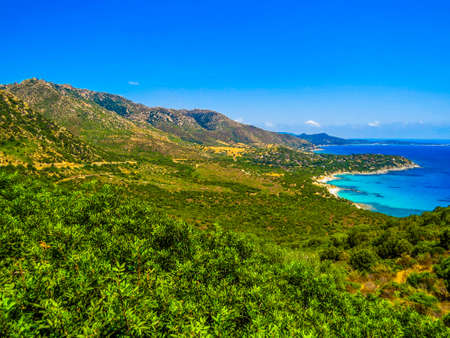 Lush Mediterranean vegetation covers the rocky coast of Capo Ferrato, Sardinia, overlooking the deep blue sea under a bright sky