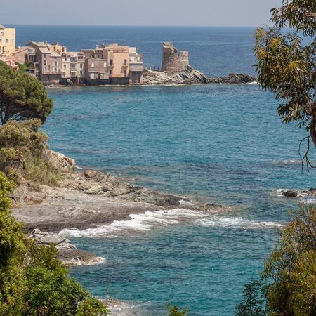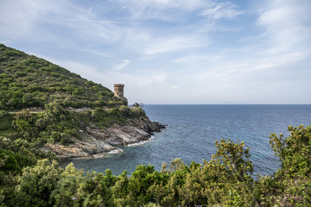 Watchtower view Roadtrip Winding road along rocky coast of Cap Corse peninsula on Corsica island France