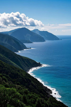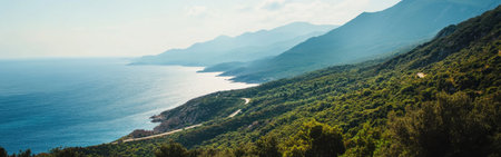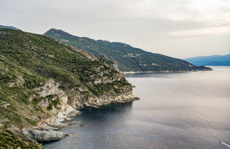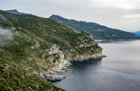 Coastline view Roadtrip Winding road along rocky coast of Cap Corse peninsula on Corsica island France