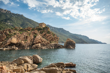 Aerial view town ruins Genoese tower of Porto Corsica France medieval watchtower Mediterranean Sea Calanches de Piana