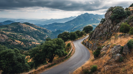 Winding mountain road landscape with scenic vistas under a cloudy sky