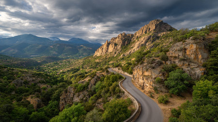 Scenic Mountain Road Under a Dramatic Sky on the Island of Corsica