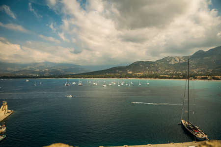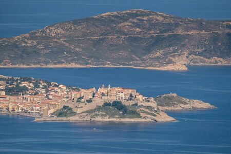 Ancient Citadel of Calvi in the Balagne region of Corsica surrounded by the blue Mediterranean sea with Revellata in the distance