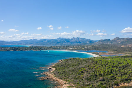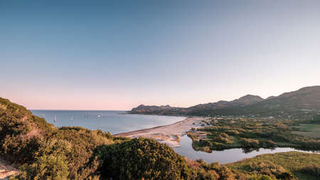 View over Ostriconi beach and the turquoise Mediterranean sea in the Balagne region of Corsica with the Desert des Agriates in the distance