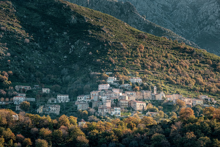 The ancient mountain village of Nessa lit by the afternoon sun and surrounded by autumnal trees in the Balagne region of Corsica