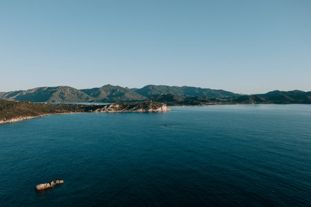 Aerial view of Corsican rocky coast with blue water of Mediterranean sea near Ogliastro, Corsica, France