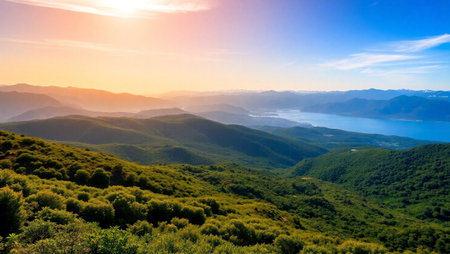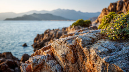 Warm sunset casts a golden glow over rugged rocks and vibrant foliage, with distant mountains meeting calm azure waters under a peaceful sky.