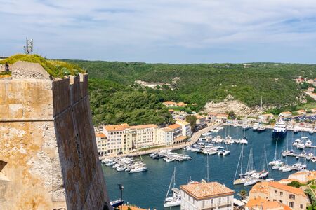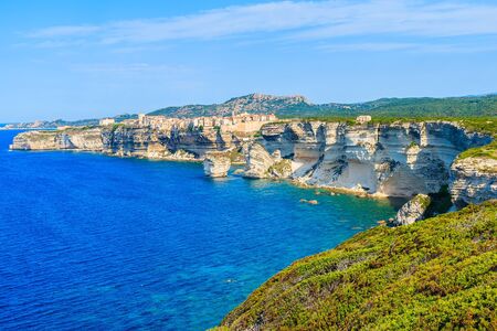 A view of Bonifacio old town built on high cliff above the sea, Corsica island, France