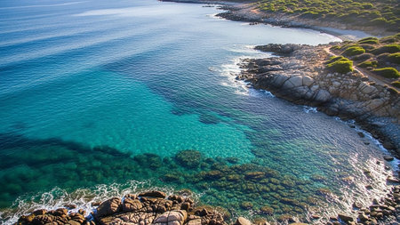 Aerial top down shot of a stone shoreline and turquoise sea water illuminated by the sun.