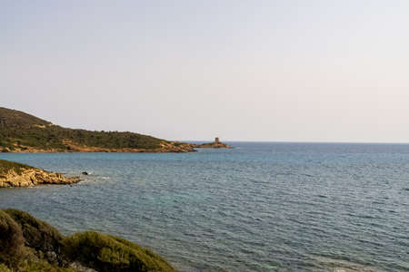 Beautiful view of the southern Sardinian sea. Note the historic Saracen tower on the rock formations.