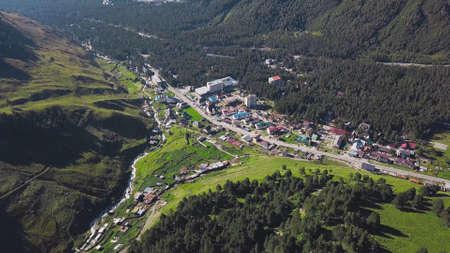 Top view of modern town located in mountain valley. Clip. Thriving town located between mountains. City in mountainous area surrounded by summer greenery