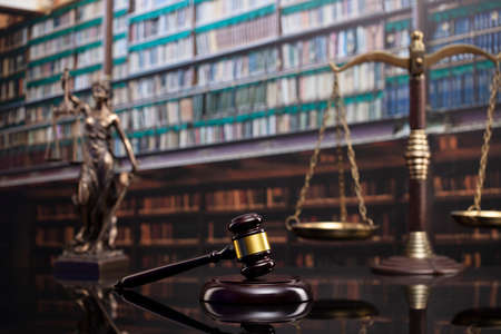 Law and justice concept. Gavel of the jugde, Themis sculpture and scale of justice in the court library.