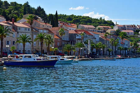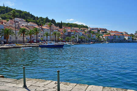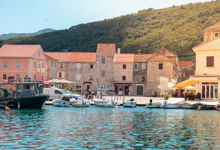 View of a small town center of the town Starigrad at Hvar island. Old small boats in the water as life goes on in a small village on a warm summer day