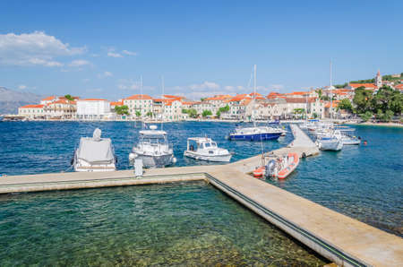 Amazing view of yacht marina and old town Supetar, Brac island, Croatia. Beautiful sunny day.