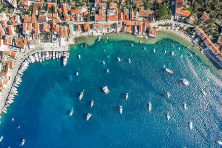 Aerial overhead drone shot of yachts on Adriatic sea near Vis Island in Croatia summer