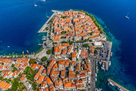 Aerial helicopter shoot of Korcula old town. Dubrovnik archipelago - Elaphites islands