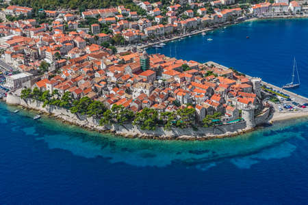 Korcula. Historic town of Korcula aerial panoramic view, island in archipelago of southern Croatia
