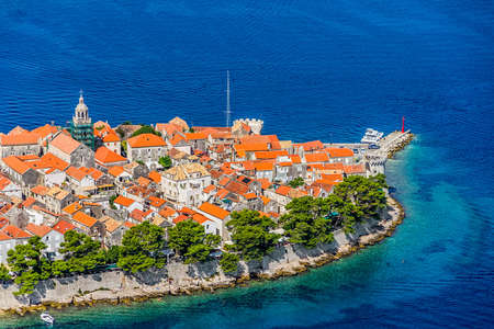 Korcula island. Historic town of Korcula aerial panoramic view, island in archipelago of southern Croatia