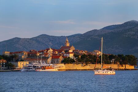 Korcula island view at sunset. Old town Korcula panorama view at sunset.