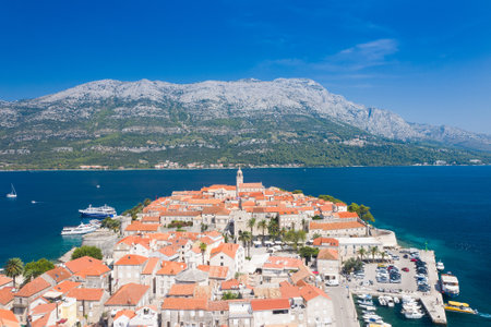 Aerial view of Korcula town on the island of the same name. View from Peljesac peninsula.