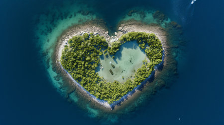Captivating Aerial Spectacle: Paradise Mediterranean Bay Enveloped by Majestic Mountains and Serene Turquoise Waters, Adorned with Floating Motorboats and a Verdant Island – A Breathtaking Drone's Glimpse of Peljesac Peninsula