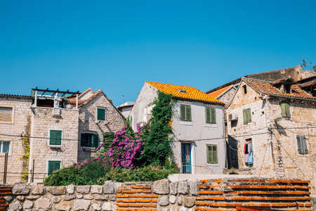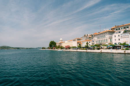 Ancient houses against the background of blue sky and azure sea on the embankment of Sibenik, Croatia