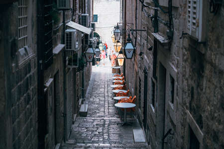 Street view in old town of Dubrovnik, Croatia. Old town streets and architecture.