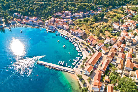 Idyllic coastal village of Racisce on Korcula island aerial view, southern Dalmatia region of Croatia