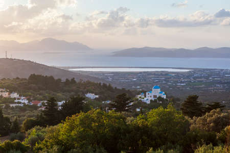 Church in Kos Island at sunset to the surrounding island landscape. Greece.