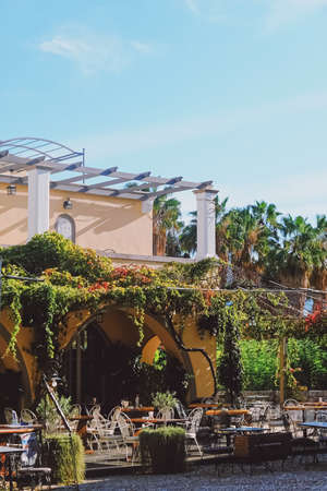Kos Island, Greece circa May 2020: Empty local restaurant outdoors