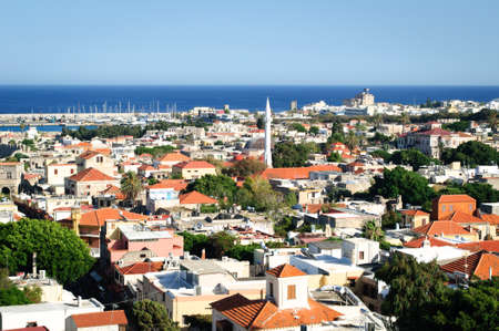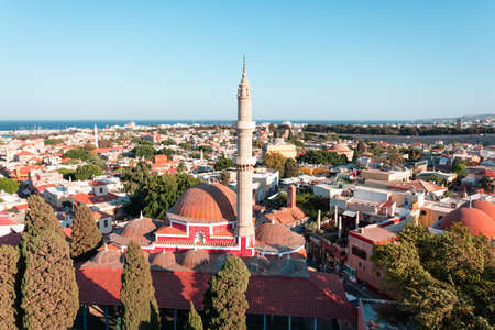 View of Ibrahim Pasha mosque and the old town of Rhodes, Greece.