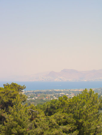 Kos, Greece: View of Turkey across the Aegean Sea, from the ancient ruins of the Asclepion on the island of Kos.