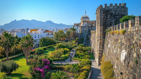 The ancient stone walls of Ceuta rise majestically against a clear blue sky, framed by beautiful gardens and the picturesque backdrop of mountains.