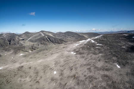Mountain region between Aurland and Laerdal in Norway. Rocky landscape with snow and lake. National tourist scenic route Aurlandsfjellet.