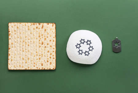 Passover holiday celebration with kosher matzah unleavened bread on traditional pesach plate of Jewish Pesach
