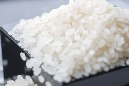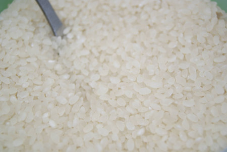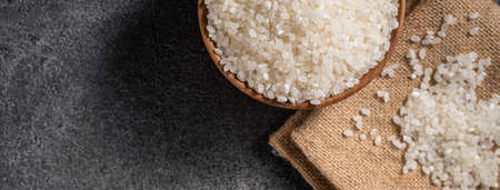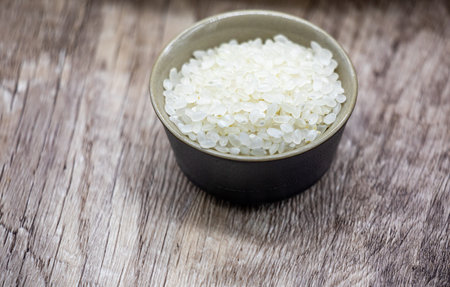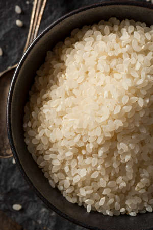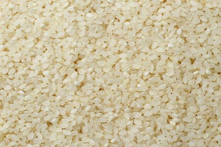 Raw white rice with short grain for pudding or Japanese sake in a glass jar. Top of view