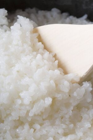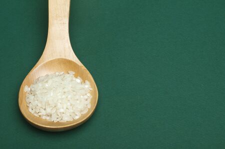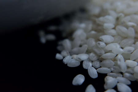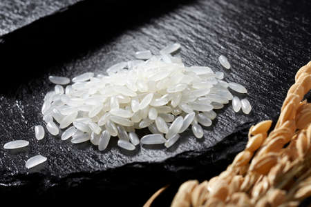 Close up of japanese rice in a black spoon.. Japonica rice grains. sometimes called sinica rice, is one of the two major domestic types of Asian rice varieties.