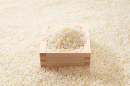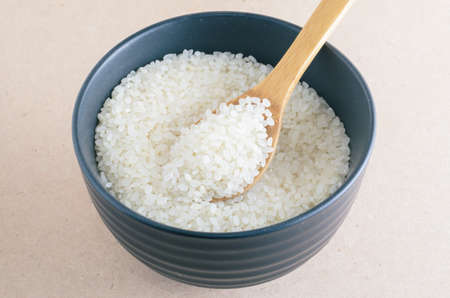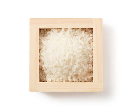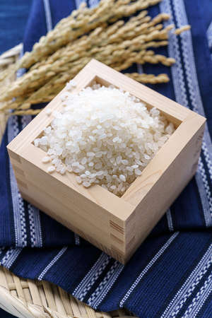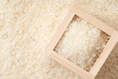 close up of japanese rice in a wooden cup. Japonica rice grains. sometimes called sinica rice, is one of the two major domestic types of Asian rice varieties. Japonica rice is extensively cultivated and consumed in East Asia.