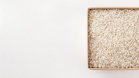 Rice grains in a square-shaped container, top view with white background and copy space for product labels