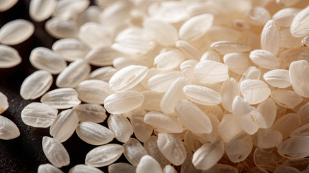A detailed close-up image of raw rice grains scattered on a dark surface, showcasing the unique texture and natural appeal ideal for culinary presentations.