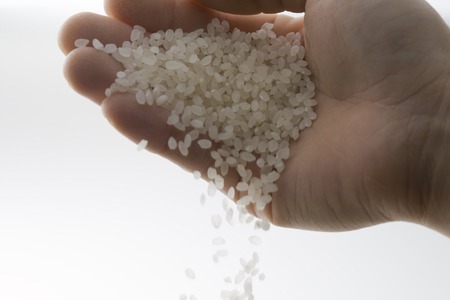 Heap of Japanese uncooked short grain rice cultivated (Koshihikari) after polished inside male hands.